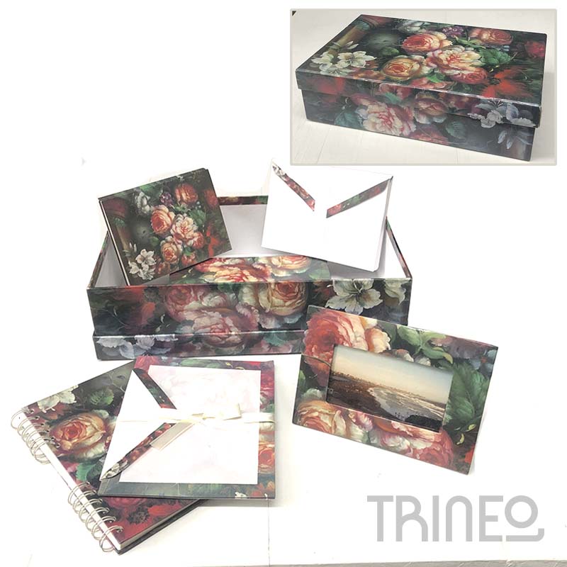 CAJA CON PAPELES + SOBRES + POSTALES + LIBRETA + PORTARRETRATO